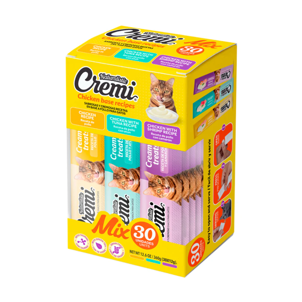 Naturalistic Cremi Box Chicken Food 60 sachet, es una cajita con snacks cremosos para gatos de todas las edades.