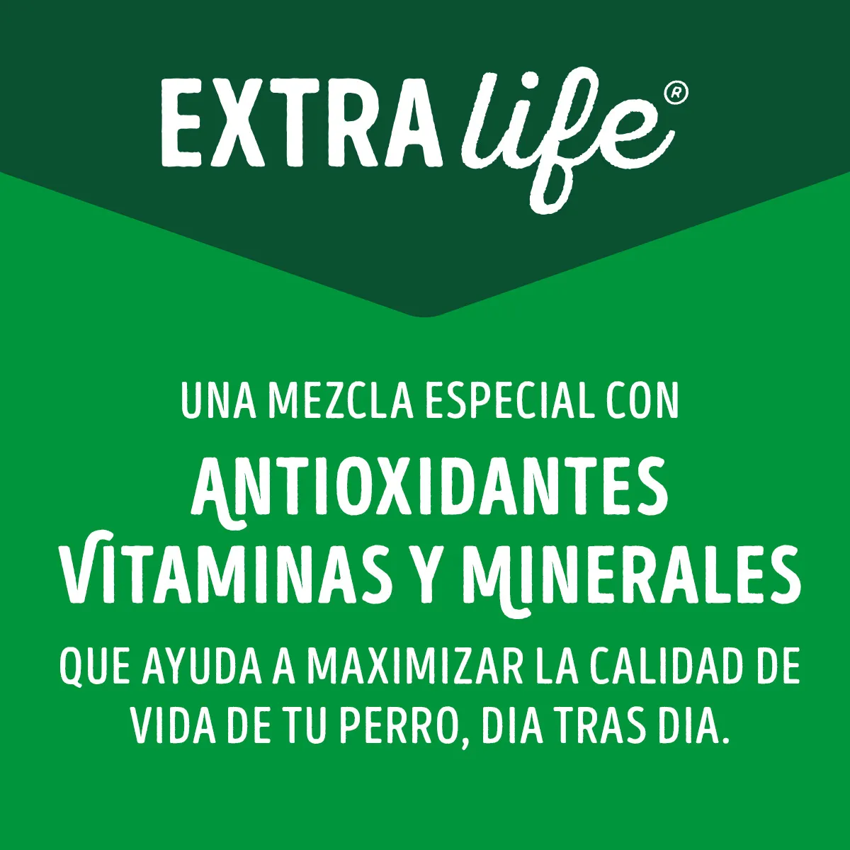 Agua suficiente para proceso, carne de pollo y/o cordero, hígado y/o vísceras de cerdo, gluten de trigo y/o concentrado proteico de soya/soja y/o gluten de maíz, carne vacuna, almidón de maíz, glicina, dextrosa, fosfato bicálcico, carcasa de pollo, hígado de pollo, sal, cloruro de potasio, vitaminas (A, D3, E, K3, B1, B2, B3, B5, B6, B7, B9, B12, cloruro de colina), carbonato de calcio, minerales [(sulfatos: zinc, hierro, manganeso, cobre), (proteinatos: zinc, hierro, manganeso, cobre, selenio), yodato de calcio, selenito de sodio].