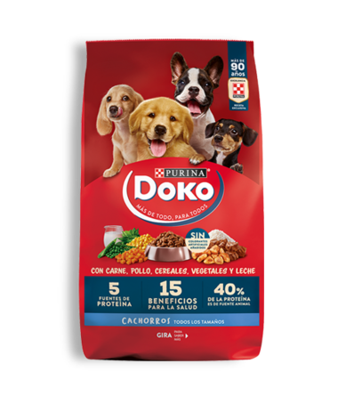 Alimento seco para cachorros de todos los tamaños DOKO® con Carne, Pollo, Cereales, Vegetales y Leche. Un alimento 100% completo y balanceado con 5 fuentes de proteína, de las cuales 40% es de fuente animal. Un solo producto con 15 beneficios que ayudan a la salud, como músculos fuertes, piel sana, pelaje saludable, y más. Ahora sin colorantes artificiales añadidos.