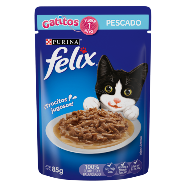 Sorprende a tu astuto gato con Purina® Felix® Gatitos Pescado, alimento húmedo completo y balanceado para gatitos, con trocitos de pescado, excelente para deleitar hasta al paladar gatuno más exigente.
