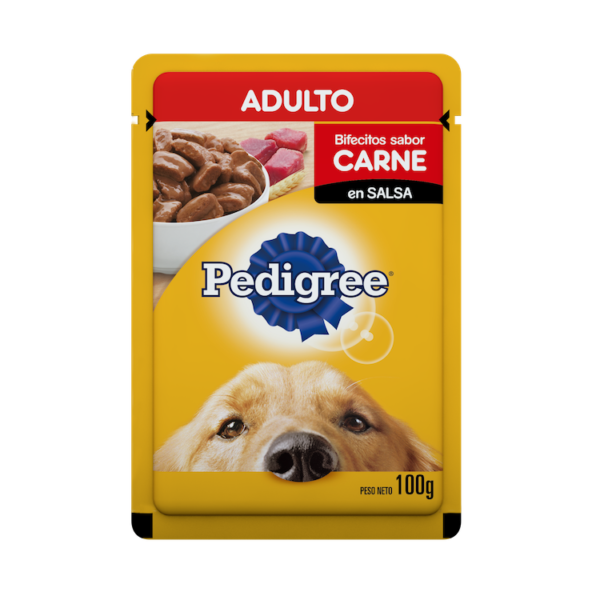 Pedigree® Sobrecito Adulto sabor carne en salsa es alimento húmedo nutricionalmente completo y balanceado formulado para el mantenimiento de perros adultos, y elaborado a base de exquisitos trocitos de carne cocidos al vapor en una deliciosa salsa: