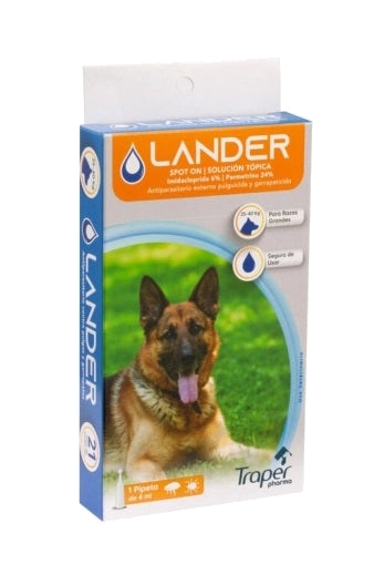 Lander contiene una combinación de ingredientes activos que permite un control eficaz contra pulgas y garrapatas. Un adulticida tópico de la familia de los neonicotinoides, Imidacloprid, permite controlar pulgas en menos de 24 horas y su combinación con un insecticida de la familia de los piretroides, permetrina, que controla Garrapatas permite a Lander mantener a nuestros perros libres de parásitos externos de forma segura.